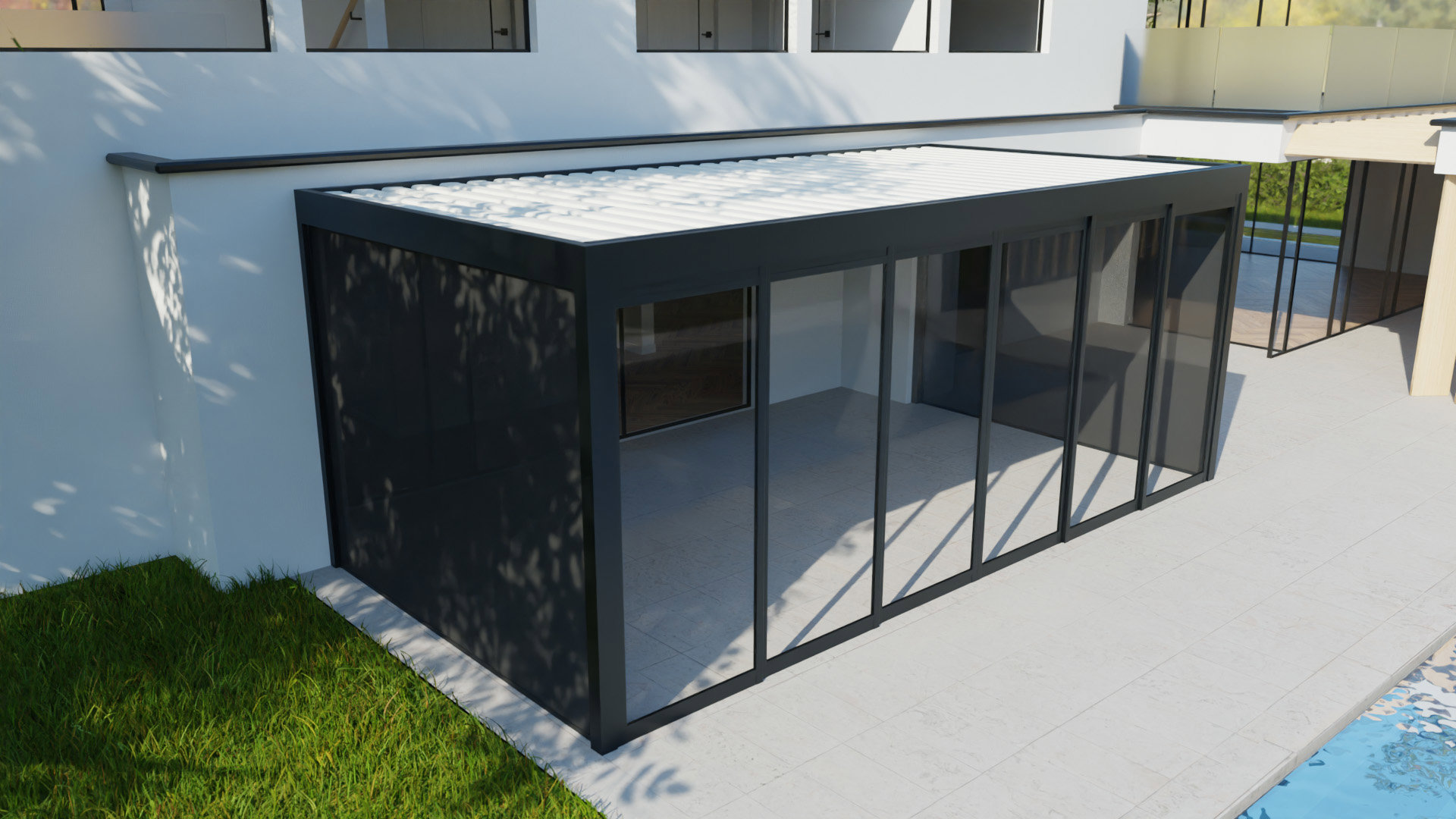 Il sistema si distingue per la facilità d'uso e per la manutenzione ordinaria minima. Lo scorrimento/apertura può essere sia verso un lato sia verso il centro come sipario. Un grande vantaggio è la facilità di installazione delle pareti scorrevoli, che completano la struttura modulare della pergola bioclimatica ARTOSI o della tettoia Carport ARTOSI.